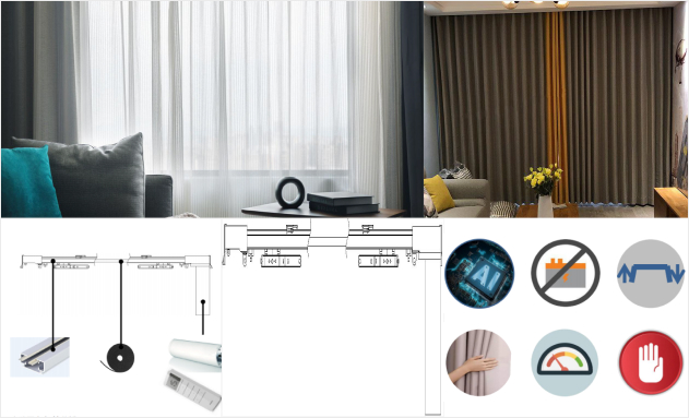 - The intelligent control, combined with the smart curtain motor, provides additional user-friendly functions. The adjustable speed feature allows users to switch between two speed settings according to their needs. The manual pull-start function enables users to slightly pull the curtain 5cm in one direction to automatically open or close the curtains. The obstacle-stop function ensures that the curtains stop automatically when encountering resistance, protecting the entire system. The automatic travel memory function sets and remembers the optimal open and close positions, preventing noise or damage from collisions. In the event of a power outage, the curtains can still be operated manually like regular curtains, ensuring continued usability.